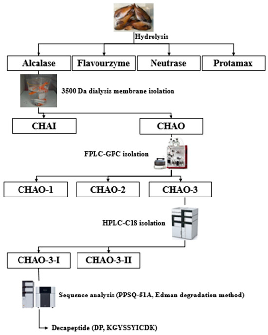 The amino acid sequence of the final isolated fraction of CHAO-3-1 from C. notate by-product hydrolysate was sequenced from the N-terminus using the automated Edman degradation method using a protein sequencer (PPSQ-51A, Shimadzu, Kyoto, Japan) in KAIST (Korea Advanced Institute of Science and Technology, Daejeon, Republic of Korea).