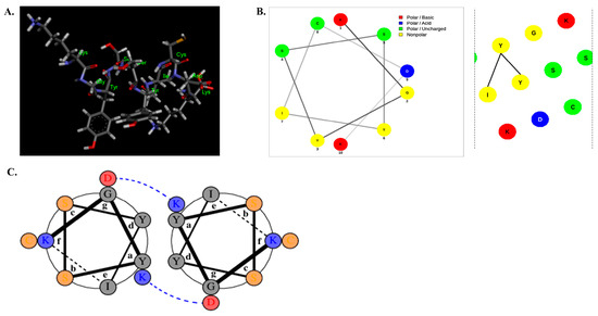 Structural characterization of C. notate by-product derived from the DP peptide: (A) Chemical structure of the DP peptide. (B) An example of a helical wheel diagram illustrated for the DP peptide, showing the net projection (left panel) and the wheel projection (right panel) for the DP peptide. (C) Antiparallel alignment of two helical wheels of the DP peptide.