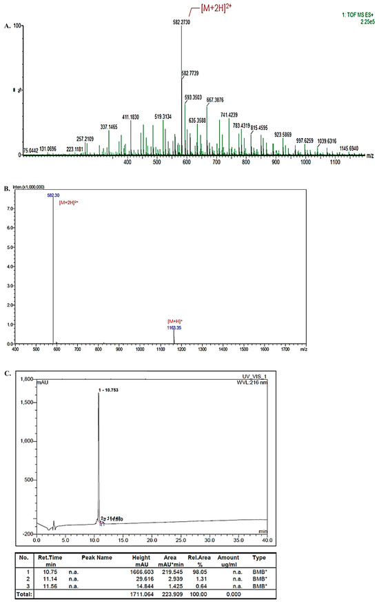 To identify the molecular weight, Liquid Chromatograph–Mass Spectrometry LC-MS (SHIMADZU LCMS-2020, Kyoto, Japan) analysis was performed, and it was detected by LC-MS at the flow rate of 0.20 mL/min under mobile phase under mobile phase 0.1% formic acid in water/acetonitrile (50:50) using a C18 column (particle size 5 µm, 4.6 mm × 250 mm). The LC-MS analysis conditions included ESI Positive mode, Nebulizing gas flow rate = 3 L/min, Curved Desolvation Line (CDL) voltage = −20.0 V, CDL Temp. = 250 °C, Block Heater Temp. 250 °C, Probe Bias = +4.5 kV, and Detector voltage = 1.5 kV. The analyzed mass-to-charge ratio (m/z) is shown in Figure 3B.