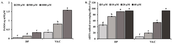 Antioxidant FRAP activity and radical scavenging activity of DP: (A) Reducing power of DP and Vit. C FRAP value, analyzed as FeSO4 equivalents (FeSO4E) in mM/μM of the sample. (B) ABTS radical scavenging activities of DP and Vit. C. Data are expressed as the means ± standard deviations (n = 3). Different superscripts in a column indicate significant differences at p < 0.05 using Duncan’s multiple range test.