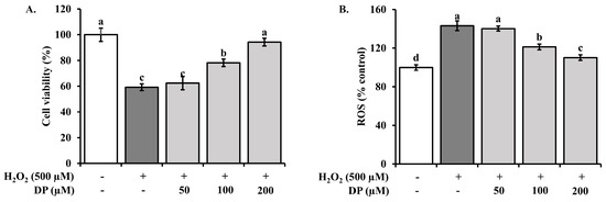 Effect of DP on cell viability and ROS in H2O2-treated HaCaT human keratinocytes; HaCaT cells were treated with different concentrations of DP (50, 100, 200 μM) and H2O2 (500 μM) for 24 h: (A) The cell viability was assessed by the MTT reduction assay, and the results are expressed as the percentage of surviving cells over the control cells (no addition of DP and H2O2). (B) HaCaT cells were incubated with 25 µM of DCFH-DA for 30 min, followed by measurement of fluorescent DCFH-DA production. Results are expressed as DCFH-DA fluorescence relative to untreated controls. Data are expressed as the means ± standard deviations (n = 3). Different superscripts in a column indicate significant differences at p < 0.05 using Duncan’s multiple range test.