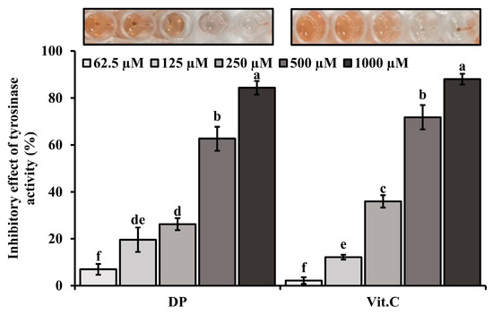 Inhibitory effect of DP on tyrosinase. The tyrosinase activity assay was performed using mushroom tyrosinase. Different superscripts in a column indicate significant differences at p < 0.05 using Duncan’s multiple range test.