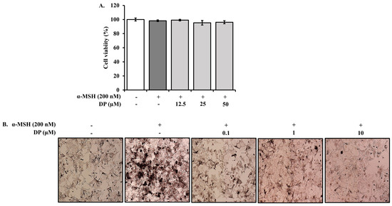 Before measuring the melanin content in B16F10 melanoma cells, the cytotoxicity of DP was assessed at concentrations of 12.5, 50, and 100 μM. No cytotoxicity was observed at any of these concentrations after 24 h (Figure 7A). For further analysis, B16F10 melanoma cells were treated with DP at concentrations of 0.1, 1, and 10 μM, along with α-MSH (200 nM), and incubated for 24 h. The melanin production was then measured. Morphological observations confirmed that melanin formation was inhibited starting from the 0.1 μM concentration of DP (Figure 7B). The results of the melanin production assay showed that the melanin content increased by 152.36% in the α-MSH treated group compared to the control group. In contrast, melanin production decreased to 120.32%, 105.24%, and 83.21% at 0.1, 1, and 10 μM concentrations of DP, respectively, compared to the α-MSH treated group (Figure 7C).
