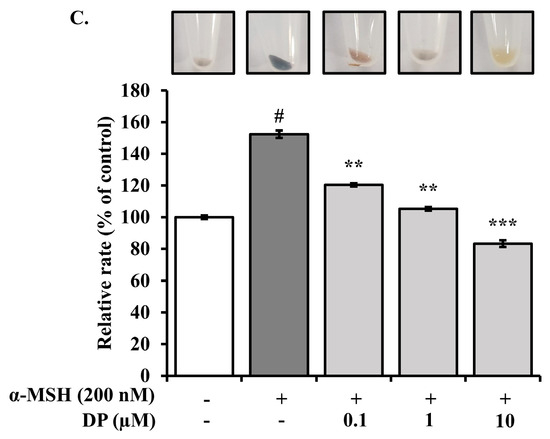 Effect of DP on cell viability and melanin content in α-MSH-induced melanogenesis in B16F10 melanoma cells; B16F10 melanoma cells were treated with different concentrations of DP and α-MSH (200 nM) for 24 h: (A) Cytotoxicity of DP in B16F10 melanoma cells (1 × 104 cells/mL) by MTT assay. (B) Changes in morphology (200× magnification) and (C) melanin content due to DP on melanogenesis in B16F10 melanoma cells. All data are expressed as the mean ± SD of the experiment. # p < 0.05 compared to the control group; ** p < 0.01 and *** p < 0.001 compared to the α-MSH control group.