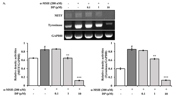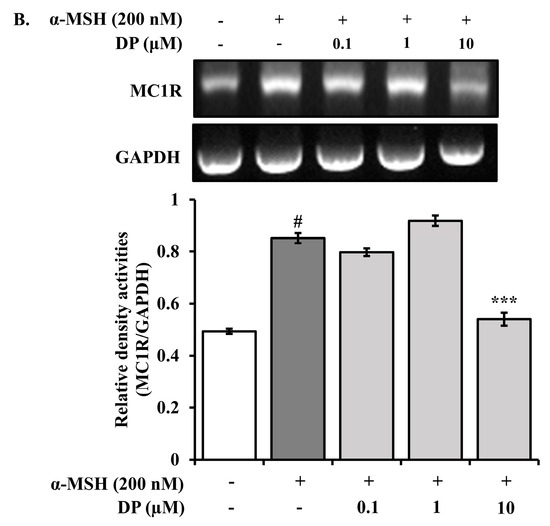Effects of DP on mRNA expression of MITF, tyrosinase, MC1R in B16F10 cells stimulated with α-MSH. B16F10 cells were co-treated with DP and 200 nM α-MSH. After treatment, the mRNA expression of (A) MITF, tyrosinase, and (B) MC1R was measured and normalized to GAPDH expression. All data are expressed as the mean ± SD of the experiment. # p < 0.05 compared to the control group; ** p < 0.01 and *** p < 0.001 compared to the α-MSH control group.