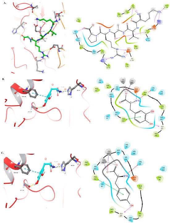 The structure of KVARP, L-TYROSINE, and L-DOPA is shown in yellow, with the main amino acid sequence identified as HIS85, VAL150, GLU103, GLU322, ALA323, ALA246, and LYS79; HIS85, GLY281, PHE264, and CU400; PHE264, GLY 281, GLU256, HIS85, and CU400 (Figure 9A–C, left panel). The structure of KGYSSYICDK (Figure 9D, left panel) identified as LYS79, HIS85, ASP348, GLU103, ARG268, and PRO270. The backbones of TYR78 and GLU103 interact with the NH2 moiety of KGYSSYICDK via hydrogen bonds. The backbone of another GLY281, HIS85, and ARG285 interact with the NH2 moiety of KGYSSYICDK via hydrogen bonding. In addition, the side chains of PRO270 also interact with the NH2 moiety of KGYSSYICDK (Figure 9D, left panel). A two-dimensional representation of the interaction between mushroom tyrosinase (PDB: 2Y9X) and the KVARP, L-TYROSINE, L-DOPA, and KGYSSYICDK peptide active site are shown in Figure 9A–D, right panel.