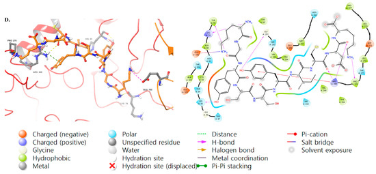 The 3D structure of mushroom tyrosinase, and the bioactive effects of KVARP (Figure 9A), L-TYROSINE (Figure 9B), L-DOPA (Figure 9C), and KGYSSYICDK (Figure 9D) peptide were concatenated with Schrödinger Suite software. Water molecules in the protein-crystal structure must be removed before the docking procedure. The molecular docking results about mushroom tyrosinase KVARP, L-TYROSINE, L-DOPA, and KGYSSYICDK peptide, respectively, were showed in best interaction poses with −8.64 kcal/mol of docking score and −19.35 kcal/mol of MMGBSA score (Figure 9D). Current commercially used KVARP is −6.66 kcal/mol of docking score and −18.40 kcal/mol of MMGBSA score (Figure 9A), while L-tyrosine and L-DOPA were −9.01 and −8.39 kcal/mol of docking score and −14.60 and −15.08 kcal/mol of MMGBSA score (Figure 9B,C). KGYSSYICDK peptide has numerous interactions with the amino acid residue of human tyrosinase and is similar to that of mushroom tyrosinase (Figure 9D).