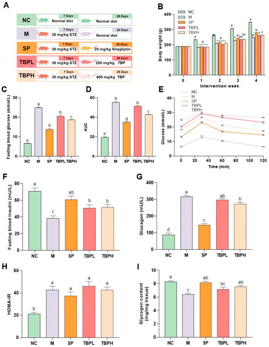 Effects of <1 kDa peptide fraction from Takifugu bimaculatus fish skin hydrolysate (TBP) on body weight and basic indices in rats with T2DM. (A) Experimental protocol; (B) body weight; (C) fasting blood glucose, (D) oral glucose tolerance test, and (E) area under curve, AUC; (F) Fasting blood insulin; (G) glucagon; (H) homeostasis model assessment of insulin resistance, HOMA-IR; (I) glycogen. Results are expressed as the mean ± standard error of the mean (SEM) (n = 6). Different letters represent significant differences (p < 0.05) between groups using one-way analysis of variance (ANOVA) and Duncan’s multiple-range test. The same letters indicate p > 0.05.