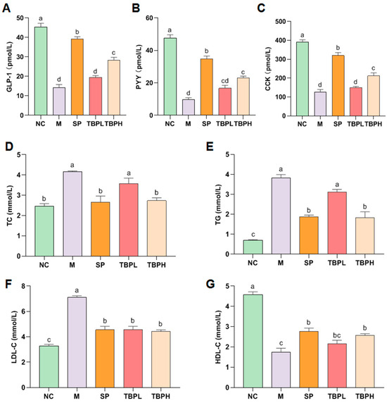 Effect of TBP on blood-glucose-related hormones and blood lipid metabolism in rats with T2DM. (A) glucagon-like peptide-1, GLP-1; (B) peptide tyrosine tyrosine, PYY; (C) cholecystokinin, CCK; (D) total cholesterol, TC; (E) triglyceride, TG; (F) low-density lipoprotein cholesterol, LDL-C; (G) high-density lipoprotein cholesterol, HDL-C. Results are expressed as the mean ± standard error of the mean (SEM) (n = 6). Different letters represent significant differences (p < 0.05) between groups using one-way analysis of variance (ANOVA) and Duncan’s multiple-range test. The same letters indicate p > 0.05.