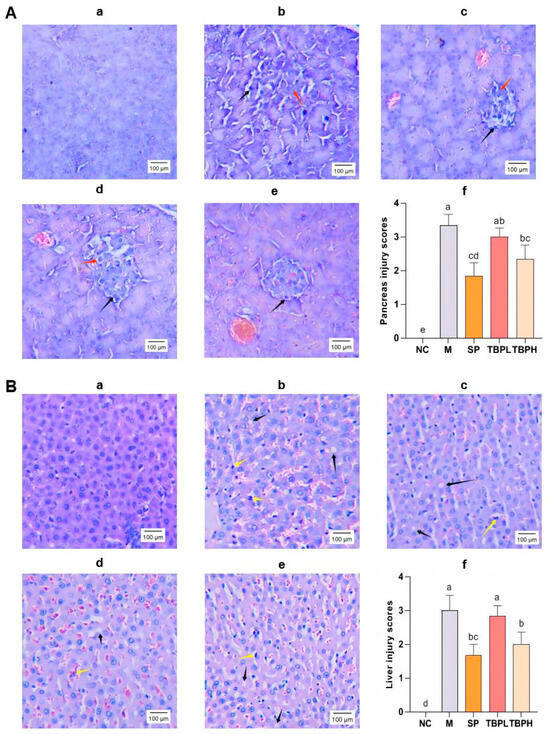 Rats in the M group showed evident necrosis in the pancreatic islets, along with the infiltration of inflammatory cells compared with the NC group, according to hematoxylin and eosin (H&E) staining (Figure 3). Furthermore, the liver tissue demonstrated slight abnormalities, including increased lipid droplets, inflammatory cell infiltration, disrupted cell arrangement, mild hepatic sinusoidal dilation, and red blood cells in the hepatic sinusoids. Following supplementation with SP and TBP, the pancreatic structure showed marginal abnormalities with a tendency toward normalization. The quantity of liver lipid droplets decreased, although some residual intercellular space persisted, indicating a moderately aberrant structure with a slight enhancement from the M group. Figure 3(Af,Bf) showed that both the SP and TBPH groups had histopathological scores significantly lower than that of the M group (p < 0.05). Meanwhile, the histopathological score of the TBPL group decreased, but it was not significantly different from that of the M group. Overall, these results indicate that TBPH exerts a positive influence on mitigating histopathological damage in the pancreas and liver.