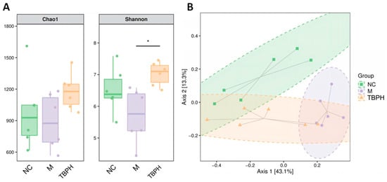 Effect of TBPH on the composition of the gut microbiota. (A) Chao1 and Shannon indices and (B) principal coordinate analysis (PCoA). The statistically significant correlation between two variables was tested using the Kruskal-Wallis one-way ANOVA test, * p < 0.05.