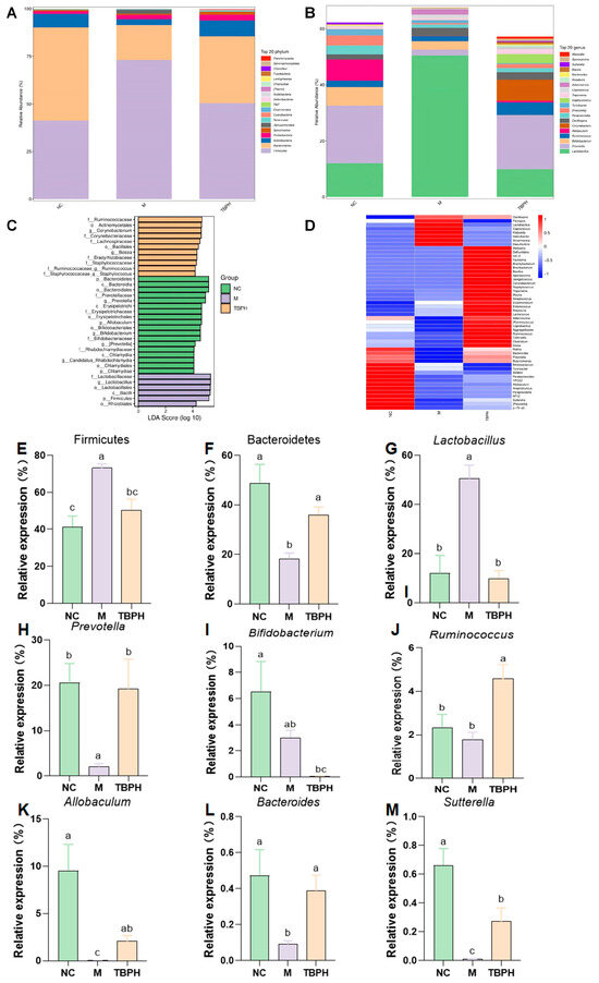 Effect of TBH on the gut sample composition. (A) Relative abundance at the phylum level and (B) genus level; (C) LDA, linear discriminant analysis, LDA score > 4; (D) Heatmap of bacterial distribution at the genus level; (E–M) the relative abundance of key bacteria at the phylum and genus level. Results are expressed as the mean ± standard error of the mean (SEM) (n = 6). Different letters represent significant differences (p < 0.05) between groups using one-way analysis of variance (ANOVA) and Duncan’s multiple-range test. The same letters indicate p > 0.05.