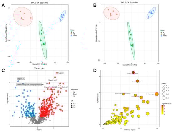 Effect of TBH on untargeted metabolomics in gut samples. (A) Score plots of OPLS-DA in the positive modes and (B) negative modes; (C) volcano plot; (D) metabolic pathway enrichment analysis.