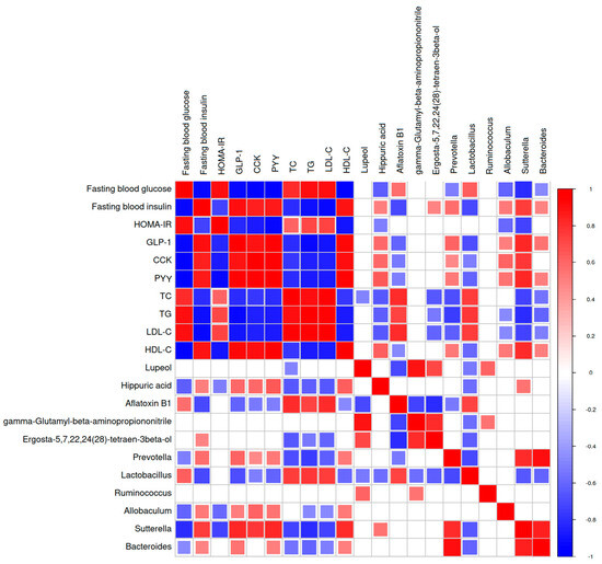 Prevotella, Allobaculum, and Sutterella positively correlated with insulin, gut hormones (GLP-1, CCK, and PYY), and hippuric acid (Figure 7). Ergosta-5,7,22,24(28)-tetraen-3beta-ol positively correlated with insulin. Regarding lipid metabolism, Prevotella, Allobaculum, Sutterella, and Bacteroides positively correlated with HDL-C and hippuric acid, and negatively correlated with TG, LDL-C, hippuric acid, and ergosta-5,7,22,24(28)-tetraen-3beta-ol.