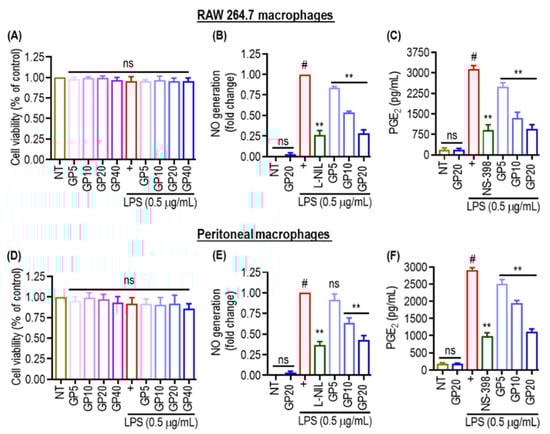 Cell viability and inhibitory effect of GP on NO and PEG2 in LPS-stimulated RAW 264.7 and peritoneal cells. (A,D) Viability of RAW 264.7 macrophages and peritoneal macrophages, respectively, after exposure to 0.5 μg/mL LPS. Viability was expressed as a percentage of the non-treated control (NT) and non-significant (ns) changes in cell viability, indicating no cytotoxic effects. (B,E) NO generation in RAW 264.7 and peritoneal macrophages, respectively. L-NIL/NS-398 was used as a positive control. (C,F) Production of PGE2 in RAW 264.7 and peritoneal macrophages, respectively. Statistical significance is indicated as follows: ns (not significant); (#) indicates p < 0.05 vs. NT. (**) indicates p < 0.05 vs. LPS alone. The data are shown as the mean ± SD of three independent experiments.