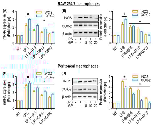 Effects of GP on LPS-induced iNOS and COX-2 in macrophages. (A,C) Quantitative PCR analysis of iNOS and COX-2 mRNA levels in GP treated (5, 10, and 20 µg/mL) RAW 264.7 and peritoneal macrophages. (B,D) Quantification of iNOS and COX-2 protein expression levels in RAW 264.7 and peritoneal macrophages. The fold change is normalized to NT using β-actin as a loading control. (#) indicates p < 0.05 vs. NT; (**) indicates p < 0.05 vs. LPS alone. The data are shown as the mean ± SD of three independent experiments.