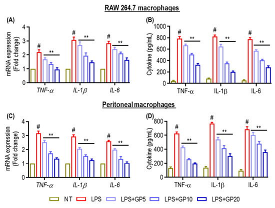 Cytokine expression and secretion in macrophage cultures. (A,C) Quantitative analysis of mRNA expression levels of TNF-α, IL-1β, and IL-6 in RAW 264.7 and peritoneal macrophages. Treatments included non-treatment (NT), LPS alone, or co-treatment with GP at 5, 10, and 20 μg/mL. (B,D) TNF-α, IL-1β, and IL-6 levels were measured in pg/mL in RAW 264.7 and peritoneal macrophages. (#) indicates p < 0.05 vs. NT; (**) indicates p < 0.05 vs. LPS alone. The data are shown as the mean ± SD of three independent experiments.