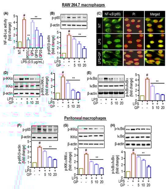 Effects of GP on NF-κB activation pathway in LPS-stimulated macrophages. (A) RAW 264.7 macrophage NF-κB luciferase reporter assay evaluating GP pre-treatment. To reduce NF-κB activity, cells were non-treated (NT), treated with LPS (0.5 μg/mL), or pre-treated with GP at 5, 10, or 20 μg/mL before LPS stimulation. (B,F) Western blot of RAW264.7 and peritoneal cell phosphorylated p65 (p-p65). (C) Immunofluorescence staining displays NF-κB p65 subunit (green) and nuclei (red, PI-stained) in RAW 264.7 cells. (D,G) Western blot analysis shows the expression of phosphorylated IKKα (p-IKKα) in RAW264.7 and peritoneal macrophages after GP administration. (E,H) In RAW264.7 and peritoneal macrophages treated with GP before LPS exposure, Western blot analysis showes expression of phosphorylated IκBα (p-IκBα). (#) indicates p < 0.05 vs. NT; (**) indicates p < 0.05 vs. LPS alone. The data are shown as the mean ± SD of three independent experiments.