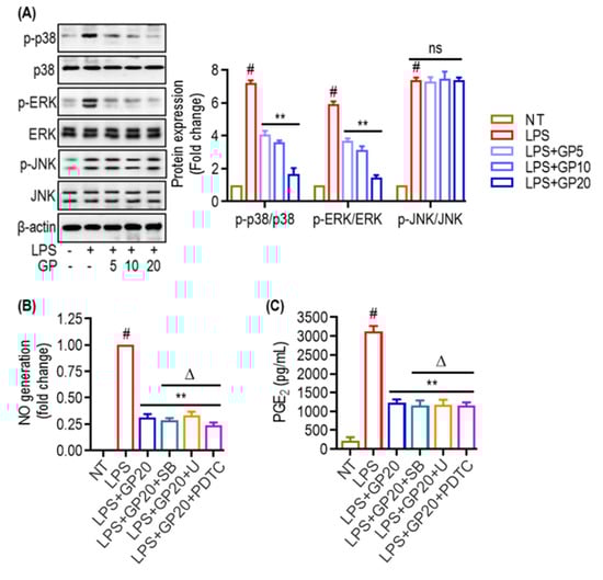 GP attenuates LPS-induced activation of MAPK pathways. (A) Representative Western blots and densitometry analysis of phosphorylated and total p38 (p-p38/p38), ERK (p-ERK/ERK), and JNK (p-JNK/JNK) in cells treated with LPS and varying concentrations of GP (5, 10, 20 µg/mL). β-actin serves as a loading control. (B) NO production was quantified by Griess assay in cells pre-treated with GP (20 µg/mL) or PDTC before LPS stimulation. NO levels are expressed as fold change over NT (non-treated) control. (C) ELISA measured PGE2 concentrations in cell culture supernatants after treatment with LPS, GP, and PDTC. Δ p < 0.05 compared to LPS + GP20 treatment. ‘ns’ denotes not significant. (#) indicates p < 0.05 vs. NT; (**) indicates p < 0.05 vs. LPS alone. The data are shown as the mean ± SD of three in-dependent experiments.