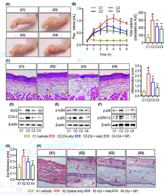 Effects in models of paw inflammation and ear edema. (A–C) The experimental six mice/group. The control, C1, received dH2O; C2, carrageenan-induced inflammation; C3, indomethacin; and C4, GP (10 mg/kg/day, p.o.) for 6 days. (A) Representative paw images from each group indicate carrageenan-induced inflammation. (B) Paw edema development over 6 h post-carrageenan injection (left y-axis) and overall edema volume (right y-axis) for each group. (C) Hematoxylin–eosin-stained paw tissue sections with yellow arrows suggest inflammatory cell infiltration. Right: quantified inflammatory score. (D–F) Western blot analyses show iNOS and COX-2 expression, NF-κB pathway phosphorylation (p-IκBα and p-p65), and MAPK pathway phosphorylation (p-p38 and p-ERK1/2) among groups. (G,H) The experimental mice groups had six mice each. X1 received dH2O as the control, X2 received xylene (xyl)-induced ear edema, X3 received indomethacin (indo), and X4 received GP (10 mg/kg/day, p.o.) for 6 days. In the xylene-induced ear edema model, ear tissue thickness demonstrates edema severity for each group. Edema and inflammatory cell infiltration are visible in stained ear tissue (red arrows). A hash symbol (#) indicates a significant difference from C1 or X1, whereas an asterisk (**) indicates a significant difference from C2 or X2 (p < 0.05).