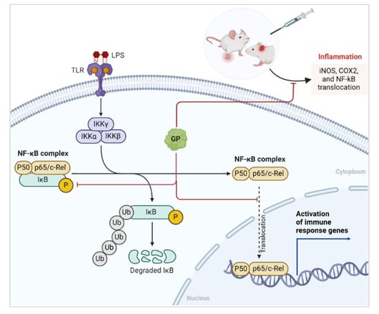 The molecular mechanism (Figure 7) through which GP exerts its anti-inflammatory effects was studied. The diagram highlights the involvement of the NF-κB signaling pathway, a crucial regulator of inflammatory responses. Under inflammatory conditions induced by LPSs, Toll-like receptors (TLRs) activate the IKK complex (IKKα, IKKβ, and IKKγ), leading to the phosphorylation and subsequent ubiquitination of IκB. The degradation of IκB releases the NF-κB complex (p50 and p65/c-Rel), allowing it to translocate into the nucleus and activate the genes responsible for inflammation, such as iNOS and COX-2.