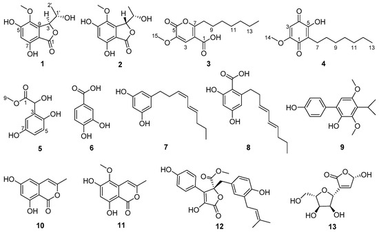 Meanwhile, the other eight known compounds were identified as protocatechuic acid (6) [15], 5-[(3Z,5E)-3,5-nonadienyl]-1,3-benzenediol (7) [16], 2,4-Dihydroxy-6-(3E,5E)-3,5-nonadien-1-ylbenzoic acid (8) [17,18], 3,5-Dimethoxy-4-(1-methylethyl)[1,1′-biphenyl]-2,4′-diol (9) [19], 3-Methyl-6,8-dihydroxyisocoumarin (10) [20], 6,8-dihydroxy-5-methoxy-3-methyl-1H-isochromen-1-one (11) [21], butyrolactone I (12) [22], polybotrin (13) [23], respectively, by comparing their NMR data (Supplementary Information) to previous reports. According to the literature, 11 exhibited a-glucosidase inhibitory activity with an IC50 value of 89.4 μM [24], and 12 had an acetylcholinesterase inhibiting effect [25].