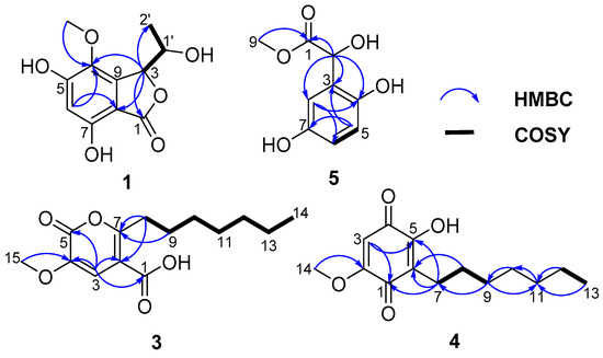 Compound 5 was isolated as a brown oil and had the molecular formula C9H10O5 as determined by HRESIMS data at m/z 221.0429 [M+Na]+. The 1H NMR of compound 5 shows a typical 1,2,4-trisubstituted benzene ring [δH 6.67 (1H, d, J = 3.0 Hz); 6.50 (1H, dd, J = 8.5, 3.0 Hz); 6.60 (1H, d, J = 8.5 Hz)]. The one-dimensional (1D) NMR (Table 1) and HSQC spectra of 5 showed signals of one carbonyl carbon (δC 173.3), three aromatic carbons (δC 149.7, 146.9, 126.6), three aromatic methines (δH/C 6.60/115.8, 6.50/115.2, and 6.67/114.2), one methine connected to hydroxyl group (δH/C 5.27/67.0), and one oxygenated methyl (δH/C 3.57/51.5). The HMBC correlations (Figure 2) of H3-9/C-1 revealed that the oxygenated methyl group 9-OCH3 was located at C-1. The HMBC correlations of H-2/C-1, 3, 4, and 8 indicated that C-2 was next to C-1 and C-3. Moreover, it indicated the location of the phenolic hydroxyl group (C-4) and the aromatic methine (C-8). The HMBC correlations of H-8/C-4, 6, and H-5/C-3, 7, and the COSY correlations of H-5/H-6 revealed the location of C-5, C-6, and C-7. The optical rotation of 5 was almost zero, suggesting that it was a racemate. Finally, compound 5 was named methyl α,2,5-trihydroxybenzeneacetate.