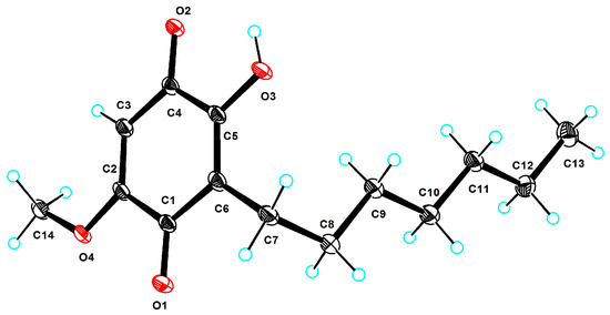 Compound 4 was obtained as a yellow solid and was determined to have the molecular formula C14H20O4 from the HRESIMS data at m/z 253.1442 [M+H]+. The 1D NMR (Table 2) and HSQC spectra of 4 showed signals of two carbonyl carbons (δC 184.5, 183.6), three alkene carbons (δC 161.9, 156.1, 120.1), one alkene methine (δH/C 5.88/104.0), six methylenes carbons (δH/C 1.29/33.0, 1.29/30.6, 1.32/30.2, 1.43/29.2, 1.32/23.7, 2.40/23.3), and two methyls (δH/C 3.83/57.2, 0.90/14.4) (one of them was methoxyl). The above data suggested that 4 had a benzoquinone skeleton and a fatty acid chain. The COSY correlations (Figure 2) of H2-9/H2-8/H2-7 and H2-12/H3-13 and the HMBC correlations of H3-13/CH2-11 revealed that C-7–C-13 was a fatty acid chain. The HMBC correlations of H2-7/C-1, C-5, C-6, and H2-8/C-6 revealed that CH2-7 was located at C-6. The HMBC correlations of H3-14/C-2 indicated that the 14-OCH3 was located at C-2. Furthermore, the X-ray crystal structure of 4 (CCDC 2363995, Figure 5) obtained by slow evaporation in CH3OH at room temperature further confirmed the above elucidation of the planar structure. Compound 4 has been previously identified as a synthetic product, which was synthesized to illustrate the structure-activity relationship against α-glucosidase of the embelin derivatives [14]. Here we reported for the first time that this compound has been explored from nature and confirmed as a new natural product. Therefore, the compound was named embelin A.