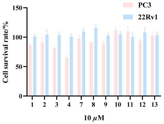 The cell survival rate of compounds 1–4 and 7–13 at 10 µM. All experiments were performed at least three times. The data are presented as the mean ± SD of representative experiments.
