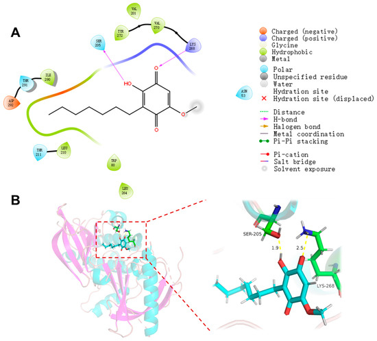 AKT1 (NP_005154.2) was involved in the growth, survival, and metabolism of cells [30]. Studies have shown that AKT1 protein could interact with UHRF1, but inhibited AKT1-induced phosphorylation of UHRF1 could induce degradation of UHRF1 protein, thereby reducing the interaction between UHRF1 and deubiquitinase USP7 and promoting its interaction with E3 ubiquitin-protein ligase BTRC, which is of great significance for the treatment of prostate cancer [31]. Therefore, AKT1 was selected as the docking target for further research. Compound 4 demonstrated a perfect interaction with the AKT1 protein (PDB ID: 3O96) with a docking score of −5.886. As shown in Figure 7, hydroxyl and ketone carbonyl groups of 4 formed two hydrogen bonds with the active site residues SER 205 and LYS 268.