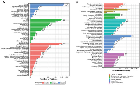 GO and KEGG enrichment analysis of Crassostrea gigas mucous proteins. (A) GO enrichment analysis shows three main categories of significant enrichment. Three colors illustrate the enrichment outcomes: blue, molecular function; green, cellular component; red, biological process. Categories are presented in descending order based on the number of enriched protein counts. (B) KEGG enrichment analysis. The six colors depict different categories: red, cellular processes; yellow, environmental information processing; green, genetic information processing; light blue, human diseases; dark blue, metabolism; purple, organismal systems. Pathways are listed in descending order based on the number of enriched peptide counts.
