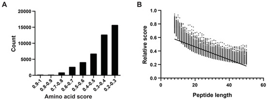 Following the method of Katia et al. [29], we determined amino acid scores using an algorithm that considered sequence length, net charge, average hydrophobicity, and other physicochemical properties. We randomly selected peptides ranging from eight to 50 amino acids in length from mucous proteins, obtaining 1000 peptides of each length category. In total, we generated 43,000 peptide sequences. We computed absolute and relative scores for all 43,000 peptides, categorizing them based on their relative scores, which predominantly fell within the range of 0.2 to 1.0. Notably, there were 10 peptides with scores between 0.9 and 1.0, all of which were eight to 10 amino acids long. The majority of peptides fell into the score ranges of 0.2–0.3 (15,718 peptides) and 0.3–0.4 (12,705 peptides), with longer lengths (Figure 2A). Subsequently, we conducted a correlation analysis between peptide length and relative scores, revealing a negative correlation where higher scores tended to correspond with shorter peptides (Figure 2B).