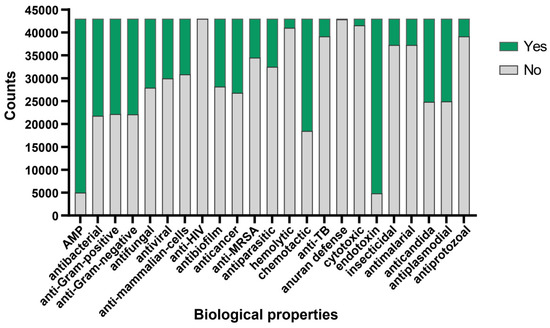 To further validate the antimicrobial activity of the peptides evaluated by aforementioned algorithm, we adopted the deep learning approach described by Jing et al. [28]. Utilizing the iAMPCN learning framework, we evaluated the 43,000 peptides to predict the biological properties of bioactive peptides. The results showed that nearly 40,000 peptides exhibited endotoxin activity, with a similar number of peptides identified as antimicrobial peptides (AMPs). Approximately 1500 peptides exhibited hemolytic properties, with fewer than 1500 peptides showing cytotoxic effects. Furthermore, nearly 60% of peptides demonstrated chemotactic properties, while over 30% exhibited antibacterial, antifungal, antiviral, anticancer, and antibiofilm activities. A small subset of peptides displayed antiprotozoal, antimalarial, insecticidal, and anti-TB activities. Approximately 20,000 peptides showed potential in treating diseases caused by plasmodia or Candida infections. Regarding common characteristics, nearly all peptides were ineffective in the anuran defense mechanism and showed no activity against HIV (Figure 3). For detailed prediction results, please refer to Supplementary File S2.