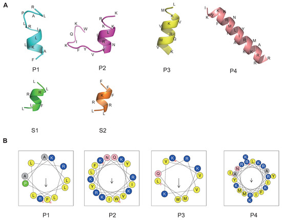 Three-dimensional structure and hydrophobic ring prediction of candidate peptides. (A) The peptide structure was predicted by the PEP-FOLD server. Amino acids are abbreviated. (B) Helical wheel projection. The structural motifs were shown as hydrophobic (yellow) and cationic (blue). Arrows inside each wheel represent the hydrophobic moment’s direction (μH).