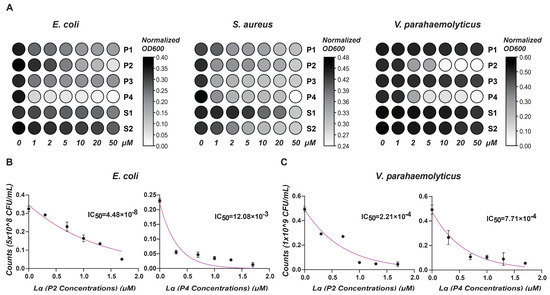 Antimicrobial activity analysis. (A) This heat map shows the effect of different antimicrobial peptide concentrations on OD value of bacterial growth. X-axis: peptide concentrations (μM). Y-axis: Normalized OD (600) values. Color intensity reflects OD changes: darker shades signify higher values; lighter shades, lower. (B) Antimicrobial activity of P2 and P4 at different concentrations (μM) against E. coli. (C) Antimicrobial activity of P2 and P4 at different concentrations (μM) against V. parahaemolyticus. Results show mean ± SD of bacterial counts (CFU/mL) and IC50 values.