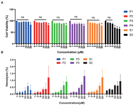 We tested the cytotoxicity of six peptides with HEK293T cells (Figure 6A). The significance was compared with cell activity at 0 μM concentration. There was no cytotoxicity of P1 and P3 within the concentration range detected. Peptides P2, P4, and S1 caused significant cell death at high concentrations of 50 μM. Regarding peptide S2, cell viability did not exceed 75% at concentrations of 10, 20, and 50 μM, indicating significant cytotoxic effects at 10 μM concentration. As shown in Figure 6B, we also evaluated the hemolytic activity of all peptides, respectively. After co-incubation with red blood cell suspension for 30 min, hemolytic rates of six peptides ranged from 0.1% to 1.5%, indicating low hemolytic activity. Hemolytic rates of 1.4% and 1.3% were observed when red blood cells were incubated with 50μM of P4 peptide, 50 μM of P2 and S1, respectively.