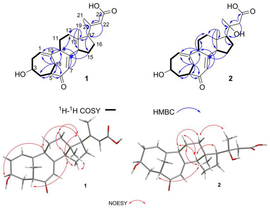 The key 1H-1H COSY, HMBC, and NOESY correlations of 1 and 2.