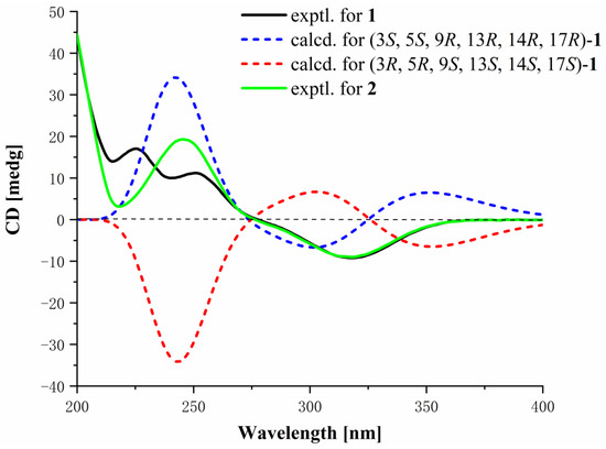 The NOEs between pairs of the protons (Figure 2), H-3/H-9, H-9/H-17, H-17/Hα-12 and Hα-12/H-14, indicated that orientations of H-3, H-9, H-14, and H-17 were on the same side of the A–D ring system, and H-17/Hα-15, H3-19/Hβ-15, H-5/H3-19, indicated that H-5 and H3-19 were on the other side of the ring system in 1, so the relative configuration of 1 was Rel-(3S, 5S, 9R, 13R, 14R, 17R). Then, the ECD calculation (Figure 3) showed that the absolute configuration of compound 1 was 3S, 5S, 9R, 13R, 14R, 17R. Finally, the structure of 1 was determined as shown in Figure 1 and named cyclocitrinoic acid A.