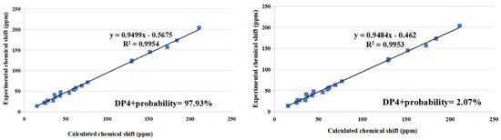Linear regression analysis of calculated 13C NMR shifts of (3S, 5S, 9R, 13S, 14R, 17S, 20R)-2 (left) and (3S, 5S, 9R, 13S, 14R, 17S, 20S)-2 (right) against the experimental shifts of 2 and the DP4+ probability for assignment of 2 to the candidate stereoisomers.