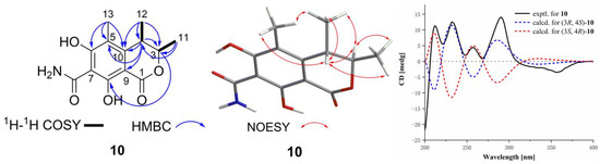 Compound 10 was obtained as yellow solid, and its molecular formula was established as C13H15NO5 by HRESIMS ion peak at m/z 266.1025 [M + H]+ (calcd for C13H16NO5, 266.1023). The unsaturation degree of seven and IR spectrum exhibited bands at 3402.16 cm−1 (hydroxyl group) and 1638.37 cm−1 (carbonyl group). A detailed analysis of 1H NMR data (Table 2) of 10 exhibited the presence of two methines at δH 4.86 (q, J = 6.6 Hz, H-3) and 3.18 (q, J = 7.1 Hz, H-4); and three methyls at δH 2.01 (s, H3-13), 1.22 (d, J = 6.6 Hz, H3-12), and 1.17 (d, J = 7.1 Hz, H3-11). The 13C NMR data and HSQC spectrum displayed 14 carbon signals including two ester carbons at δC 175.1 (C-7-CONH2) and 170.2 (C-1); six olefinic tertiary carbons at δC 168.8 (C-6), 166.0 (C-8), 144.8 (C-10), 111.9 (C-5), 100.4 (C-7), and 94.20 (C-9); two methine carbons at δC 80.2 (CH-3) and 33.9 (CH-4); and three methyl carbons at δC 18.6 (CH3-11, 12) and 9.1 (CH3-13). The 1H-1H COSY correlations of H3-11/H-3 and H3-12/H-4 revealed partial structures of CH-3/CH3-11 and CH-4/CH3-12. The above NMR data indicated that 10 had the same isocoumarin skeleton as the co-isolated 11. The main distinction was the presence of an amide group at C-7 of 10 instead of the alkene hydrogen at C-7 of 11, which was supported by HSQC correlations of 14.86 (H2-7-CONH2)/175.1 (C-7-CONH2) and 100.4 (C-7) of 10 instead of 6.29 (H-7)/100.2 (C-7). Thus, the planar structure of 10 was defined as shown in Figure 5, and the other HMBC correlations supported the deduction. To determine the absolute configurations of C-3/C-4, the NOESY analysis and ECD calculation methods were used. The NOESY correlations of H-3/H3-12 and H-4/H3-11 supported the different orientations of CH3-11 and CH3-12. As shown in Figure 5, the experimental ECD was matched to the calculated ECD spectrum of (3R,4S)-10. The 1H coupling constant data of H-3 (4.86, q, J = 6.6 Hz) and H-4 (3.18, q, J = 7.1 Hz) of compound 10 were similar to H-3 (4.68, q, J = 6.6 Hz) and H-4 (3.06, q, J = 7.1 Hz) of the known compound 11. The data provided further evidence of the differing orientations of CH3-11 and CH3-12. Consequently, the absolute configuration of 10 was determined as 3R,4S and named (3R,4S)-6,8-dihydroxy-3,4,5-trimethyl-7-carboxamidelisocoumarin.
