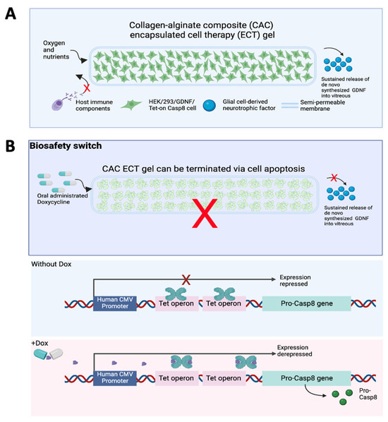 In our previous work, we fabricated an injectable and terminable collagen–alginate composite encapsulated cell therapy (CAC ECT) gel, encapsulating GDNF-producing human embryonic kidney (HEK) cells (Figure 1A). Although the presence of cell attachment ligands in collagen promotes cell–matrix interaction, it displays limited matrix stiffness. Therefore, alginate, being a widely utilized material for cell encapsulation [19,20,21,22] with good biocompatibility, limited cytotoxicity, and ensured quality [20,21,23], was added to form a semipermeable membrane and/or matrix. Alginate itself does not contain cell-binding motifs, which can potentially compromise cell viability over an extended period of time [24]. The combination of collagen with alginate allows the collagen–alginate composite (CAC) gel to better mimic the in vivo environment, providing mechanical protection to enclosed cells and enhancing mechanical stiffness [25,26]. Our earlier studies demonstrated that the CAC ECT gel showed promising therapeutic potential in rescuing photoreceptor cells in dystrophic Royal College of Surgeons rats, a rat model of photoreceptor degeneration [27]. In addition, a biosafety switch, utilizing Tet-on pro-Casp8, was established into the CAC ECT gel to enable gel functionality termination through oral Dox administration for a safe intraocular drug delivery (Figure 1B). However, the translation of the ECT system from the laboratory to clinical application remains elusive. Use of the rodent eye in research has been criticized due to rodents having smaller eyes compared to that of humans, anatomical difference and species difference between rodents and humans in drug pharmacokinetics, and the limited vitreous capacity of the rodent eye [28]. The rabbit is a commonly used animal model in ophthalmic studies due to its eye size being similar to that of humans, as well as their ease of handling, availability, and low cost [29,30]. Moreover, compared to rodents, rabbit eyes have enough space to accommodate multiple ocular implants, making it possible to evaluate multiple gel performance and therapeutic efficacy in a clinical situation.