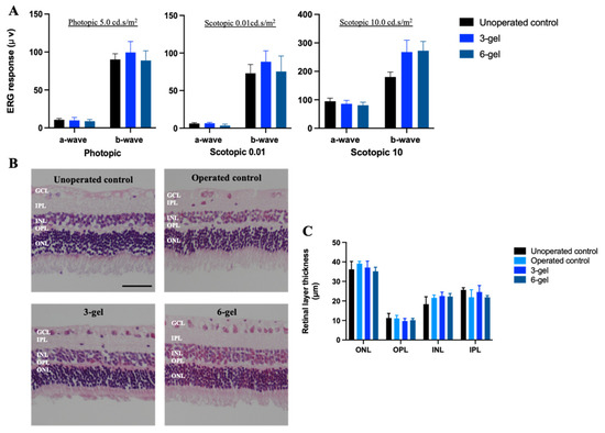 Intravitreal injection of CAC ECT gels induced no changes in retinal function and retinal cytoarchitecture (A). The photopic and scotopic electroretinographic responses indicated retinal function of different groups, including the unoperated control, three-gel, and six-gel groups at 2 weeks. Photopic 5 a-wave and b-wave (mean ± SEM, n = 11, 4, and 3 animals for unoperated control, three-gel, and six-gel groups, respectively), scotopic 0.01 a-wave and b-wave (mean ± SEM, n = 11, 4, and 6 animals for unoperated control, three-gel, and six-gel groups, respectively), and scotopic 10 a-wave and b-wave (mean ± SEM, n = 12, 6, and 4 animals for unoperated control, three-gel, and six-gel groups, respectively). (B) Representative images of H&E staining in rabbit retina: unoperated control, operated control, three-gel, and six-gel. Scale bar, 50 μm. (C) The thickness of ONL, OPL, INL, and IPL in rabbits sacrificed at 2 weeks post operation. No significant changes in retinal thickness were obtained after one-way ANOVA followed by Bonferroni’s post hoc comparisons tests. (mean ± SEM, n = 5, 3, 5, and 5 animals for unoperated control, operated control, three-gels, and six-gel, respectively). CAC ECT, collagen–alginate composite encapsulated cell therapy. ONL, outer nuclear layer. OPL, outer plexiform layer. INL, inner nuclear layer. IPL, inner plexiform layer. GCL, ganglion cell layer.