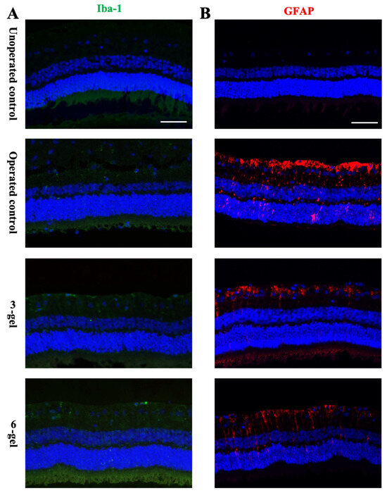 In response to foreign body biomaterials, various retinal glial cells, namely microglia, astrocytes, and Müller cells, can exhibit reactivity [35]. The sustained activation of these cells is potentially harmful to the retina, leading to the dysfunction and degeneration of cells [36]. Therefore, we next investigated the effects of surgical procedures and the presence of the CAC ECT gel on these cells. Immunohistochemistry was performed on the retinal sections. Iba-1 was used to mark microglial cells, while GFAP was detected in the visualization of astrocytes and Müller cell end feet.
