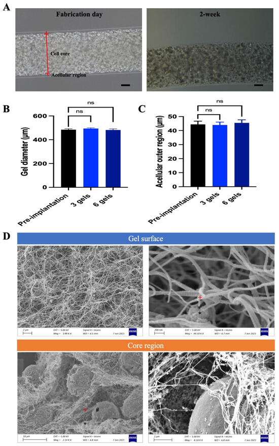 In vivo performance of CAC ECT gel after 2-week implantation. (A) Morphology of gels on fabrication day and retrieved gels after 2-week implantation. Scale bar, 100 μm. (B) Diameter of gel before and after implantation (mean ± SEM, n = 6, 6, and 6 for pre-implantation level, three-gel, and six-gel groups, respectively); one-way ANOVA with Dunnett’s post hoc test demonstrated no significant difference. (C) Diameter of acellular outer region (mean ± SEM, n = 6, 6, and 6 for pre-implantation level, three-gel, and six-gel groups, respectively). One-way ANOVA with Dunnett’s post hoc test demonstrated no significant difference. (D) SEM images showing the microstructure of the CAC ECT gel, focusing on gel surface and core region after 2-week implantation. Top row: A porous IPN network consisting of collagen and alginate assembled on the surface of the CAC gel and a magnified view of the porous network. Bottom row: cells were surrounded by collagen fibrils and CAC matrix and a magnified view of the internal structure (*: alginate, +: collagen, #: cell). CAC, collagen–alginate composite. SEM, scanning electron microscopy. IPN, interpenetrating network. ns, not significant.