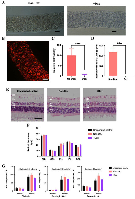 One week of Dox administration can decrease encapsulated cell viability and terminate gel functionality, without affecting retinal morphology and causing changes in retinal function. (A) Phase-contrast microscopic images of non-Dox-treated gels and Dox-treated gel. Scale bar, 100 μm. (B) Live/Dead image of retrieved gel from the Dox-treated group showing the distribution of viable cells and dying cells. Scale bar, 100 μm. (C) Relative cell viability of non-Dox-treated group and Dox-treated group assessed by MTS assay. (mean ± SD, n = 11, and 6 for Non-Dox and + Dox group). **** p < 0.0001 by unpaired t-test. (D) Accumulated GDNF levels in rabbit vitreous by GDNF ELISA after 1 week of oral Dox administration. (mean ± SEM, n = 5, and 4 for Non-Dox and +Dox group, respectively). *** p < 0.001 unpaired t-test. (E) H&E-stained retinal sections demonstrated no major change in retinal cytoarchitecture. Scale bar, 50 μm. (F) The thickness of various retinal layers including ONL, OPL, INL, IPL, and GCL was measured. (mean ± SEM, n = 5, 4 and 4 for Unoperated control, Non-Dox, and +Dox, respectively). A one-way ANOVA with Bonferroni post hoc test demonstrated non-significant differences. (G) The ERG response indicating the retinal functions of different groups, including Unoperated control, Non-Dox and +Dox. Amplitudes of major wave components quantified included photopic 5 a- and b-wave (mean ± SEM, n = 6, 6 and 4 animals for Unoperated control, non-Dox, and +Dox, respectively), scotopic 0.01 a-wave and b-wave (mean ± SEM, n = 6, 6 and 4 animals for Unoperated control, non-Dox, and +Dox, respectively) and scotopic 10 a-wave and b-wave (mean ± SEM, n = 6, 6 and 4 animals for Unoperated control, non-Dox, and +Dox, respectively). Statistical analysis using one-way ANOVA with Bonferroni post hoc test demonstrated no significant differences. Dox, doxycycline. GDNF, glial-cell-derived neurotrophic factor. SEM, standard deviation of the mean. MTS, dimethylthiazol-carboxymethoxyphenyl-sulfophenyl-tetrazolium. ONL, outer nuclear layer. OPL, outer plexiform layer. INL, inner nuclear layer. IPL, inner plexiform layer. GCL, ganglion cell layer.