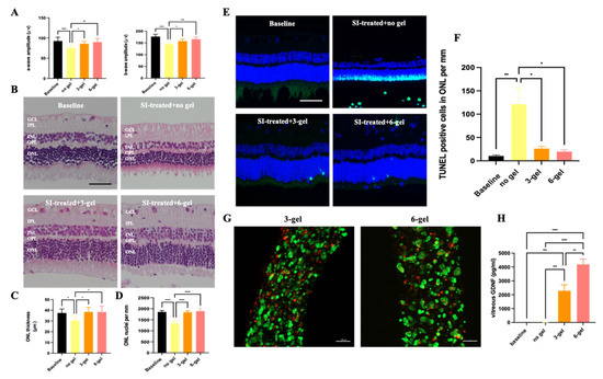 In this study, NZW rabbits were randomly assigned into 3 groups, each consisting of at least 3 animals for the in vivo gel safety study. The groups were designated as follows: Group 1 served as operated control and received the intravitreal gel procedure without gel treatment; Group 2 received an intravitreal injection of three units of gel; and Group 3 received an intravitreal injection of six units of gel. Following the administration of the intravitreal gel procedure and either three or six units of gel into the eyes, the rabbits were monitored over a 2-week period. Retinal detachment and cataract formation were assessed using a binocular ophthalmoscope to evaluate the structural integrity of the eye. Retinal function was measured via ERG to detect any functional impairments. After the 2-week observation period, the rabbits were sacrificed, and their eyes were collected for further analysis. Retinal stress markers were evaluated using immunohistochemistry (IHC), while retinal morphology was assessed through hematoxylin and eosin (HE) staining to examine any histological changes (Figure 10A).