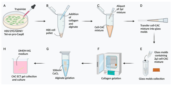 Schematic diagram showing the detailed preparation of CAC ECT gels. (A) HEK/293/GDNF/Tet-on pro-Casp8 cells were trypsinized. (B) The HEK/293/GDNF/Tet-on pro-Casp8 cell pellet was mixed with collagen and alginate. (C) An aliquot of 2 μL of the gel mixture was prepared. (D) The 2 μL gel mixture was gently transferred to the glass molds. (E) The glass molds containing the 2 μL gel were collected into a 50 mL Falcon tube. (F) The glass molds were then placed in an incubator at 37 °C for 75 min to initiate collagen gelation. (G) The glass molds were then introduced to a 100 mM CaCl2 solution followed by a CaCl2 bath to gelate the alginate. (H) The gels were collected from the molds and cultured in a DMEM-HG medium before intravitreal gel injection.
