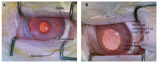 NZW rabbits were anesthetized by an intramuscular injection of a mixture of xylazine (5 mg/kg) and ketamine (45 mg/kg) (Alfasan lab, Woerden, Zuid-Holland, The Netherlands) as previously described [80]. Gels were intravitreally injected into their eyes as previously reported [27]. In brief, the right eyelid and surrounding ocular tissue were first cleaned with a diluted betadine solution (Mundipharma A.G., Frankfurt, Germany) to ensure sterility. Topical analgesia was achieved by applying 0.5% Alcaine (Alcon, Belmont, CA, USA) onto the cornea. Afterwards, 1% Mydriacyl (Alcon) was applied onto the cornea to dilate the pupil. The conjunctiva was then separated from the sclera with the help of Vaness curved scissors. One incision (less than 2 mm from the limbus) was then carefully made into the vitreous with a 20-gauge blade (Alcon, Belmont, CA, USA) under a surgical operating microscope (Zeiss) (Figure 9). Retinal and lens damage was avoided. To release enhanced intraocular pressure (IOP) during intravitreal gel injection, two holes were made near the corneal limbus using a 27-gauge needle. Three or six units of CAC ECT gels, suspended in a DMEM-HG 4-(2-hydroxyethyl)-1-piperazineethanesulfonic acid (HEPES) medium (Gibco, Grand Island, NY, USA), were injected into the vitreous through sterilized round 0.5 mm thick gel-loading pipette tips (Corning, GA, USA). Upon completion of intravitreal gel injection, the wound was closed using 8-0 nylon suture. Finally, a subconjunctival injection of 2 mg/kg gentamicin (Vetone, Sydney, New South Wales, Australia) was given. A topical administration of antibiotic ointment (Tobrex, Fort Worth, TX, USA) was applied onto rabbit cornea for seven consecutive days to prevent post-operative infection. For rabbits serving as the operated control, one incision into the vitreous was made with an intravitreal injection of the same volume of the DMEM-HG HEPES medium.
