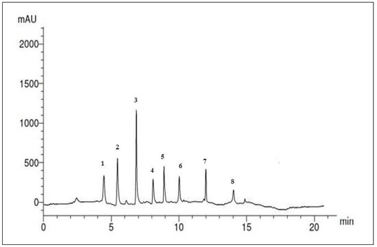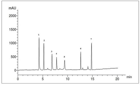 Similarly, the flavonoid compounds in the SP ethanolic extract were also identified. Figure 2 and Table 3 present the separation of seven compounds under the specified conditions. The concentrations of flavonoid compounds (µg/mL) in the SP ethanolic extract could be arranged in descending order as follows: quercetin (15.30 µg/mL), luteolin (6.41 µg/mL), rutin (6.20 µg/mL), catechin (5.26 µg/mL), kaempferol (3.36 µg/mL), apigenin (3.51 µg/mL), and naringin (3.12 µg/mL).