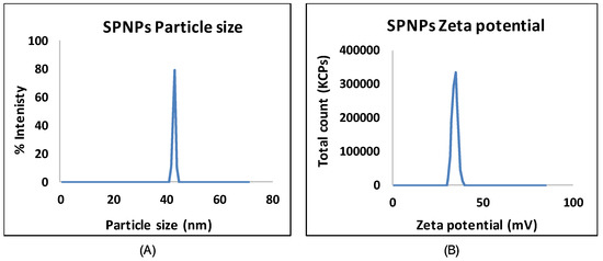 Particle size distribution (A) and zeta potential (B) of the SPNPs.